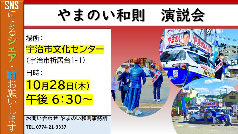 山井和則個人演説会を、28日(木)6時半から宇治文化センターで開催します。