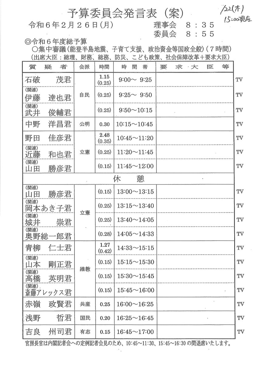 本日は予算集中質疑。「説明責任を果たす」と岸田総理は何十回も繰り返しているのだから、当然公開でしょう。そうでなければ参考人招致で国民に説明を。#政倫審#裏金衆院政倫審 野党“公開を” 自民 議員の傍聴認める案で調整か