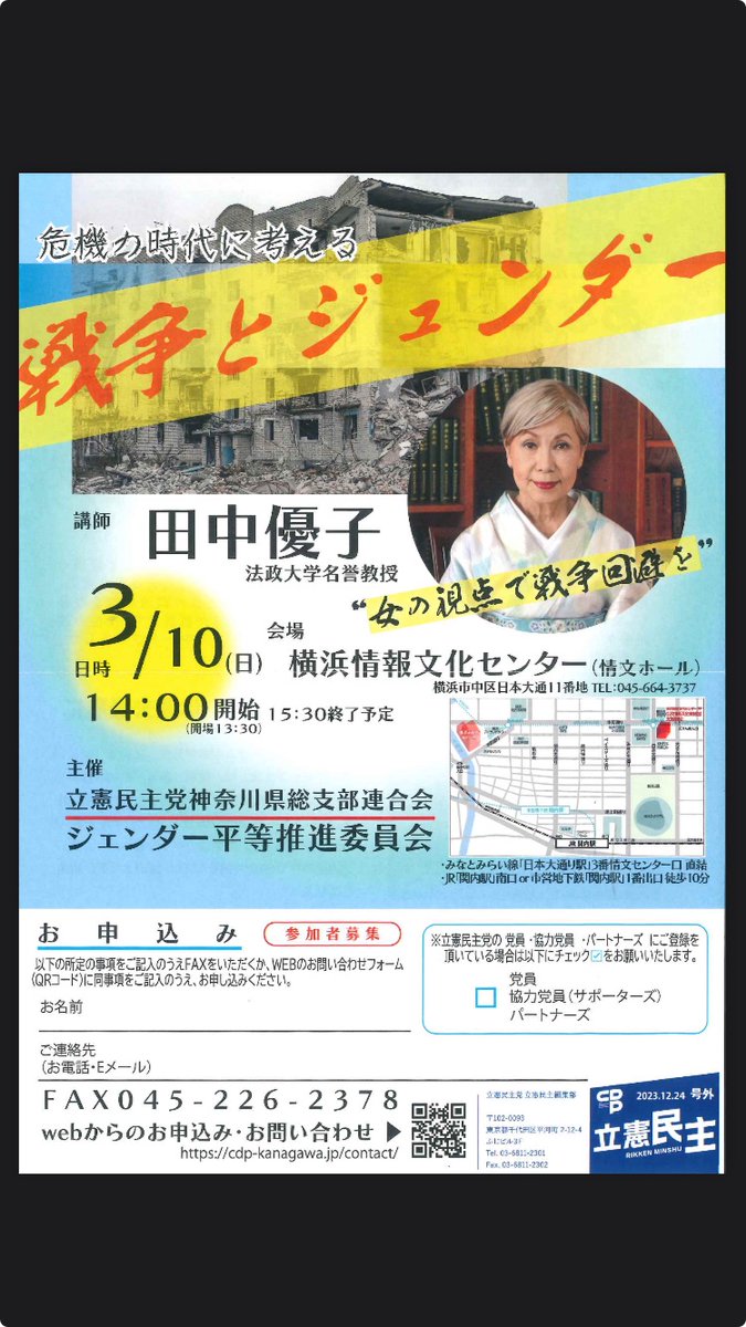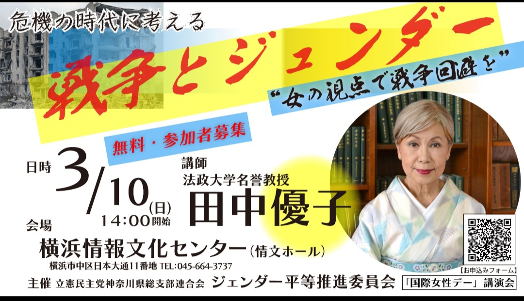 #国際女性デー にちなみ県連ジェンダー推進委員会主催第2弾。3/10(日)14:00〜#田中優子 元法政大総長の講演会(無料)を開催❗️皆さんぜひお越しください❗️戦争では武器を持たない多くの女性、子どもが犠牲に。戦争回避が政治の責任。#横浜情報文化センター#日本大通り駅(みなとみらい線)