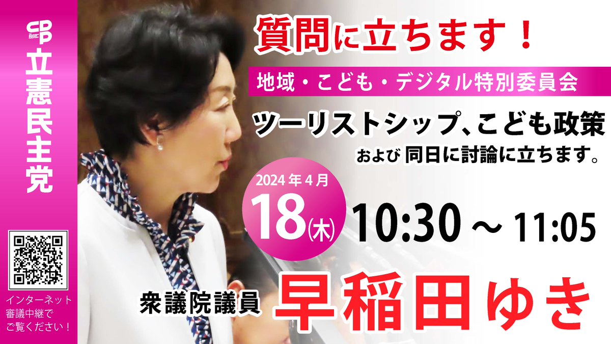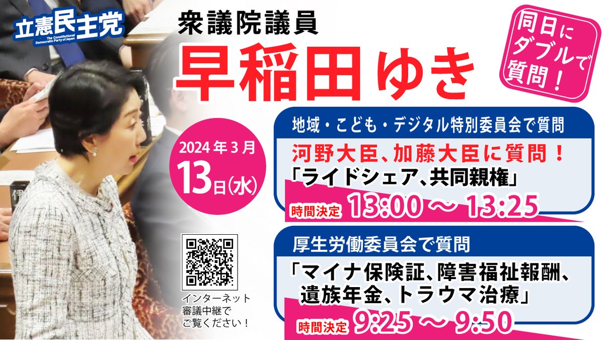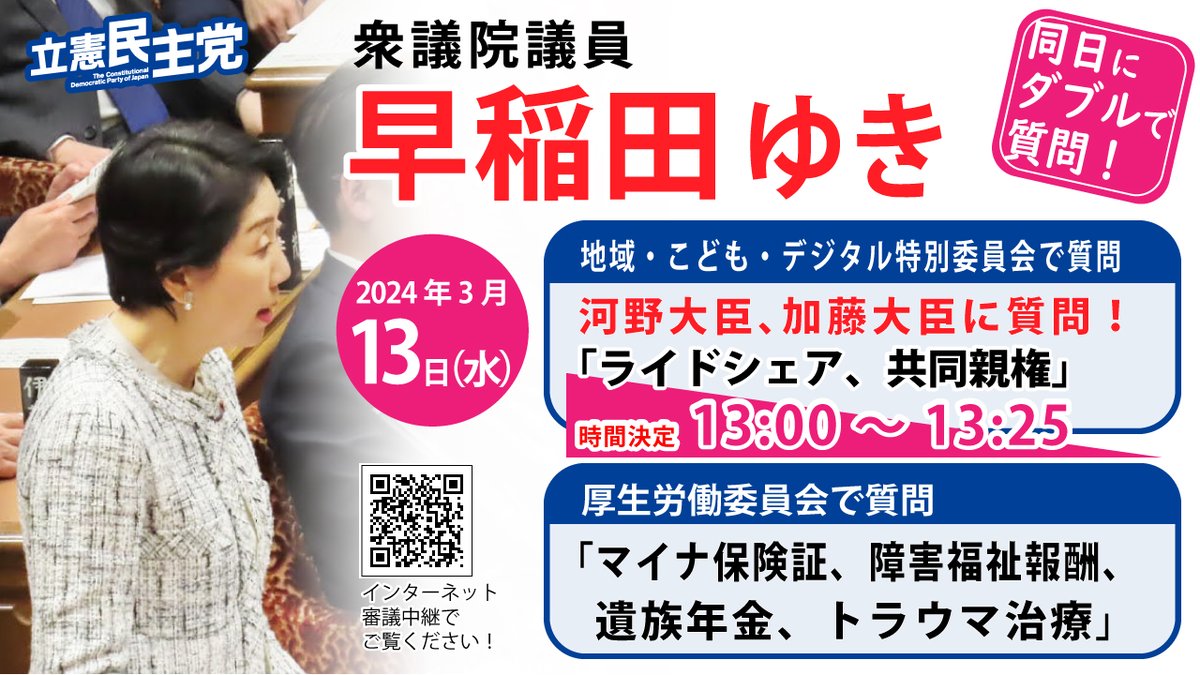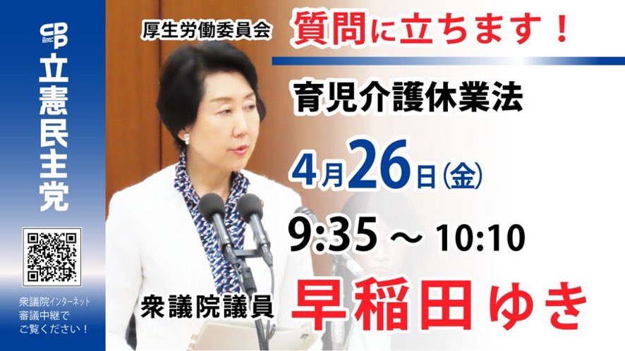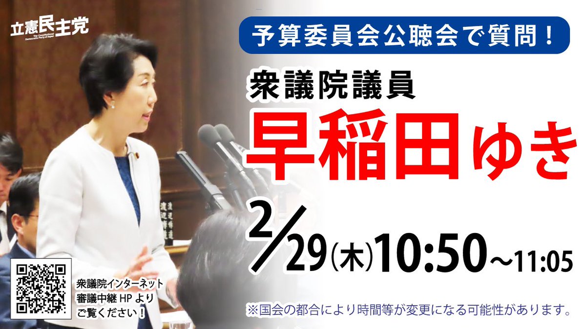 本日の質問時間が変更になりました。11:05~11:30です。衆議院インターネット審議中継HPhttps://shugiintv.go.jp/jp/