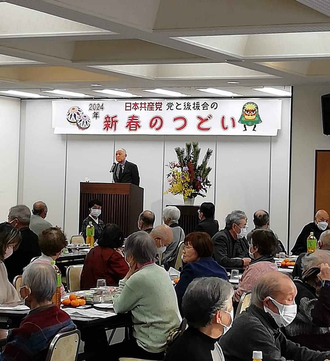 近畿大学の池上申一名誉教授が講演しました。私も挨拶を行い、今後の論戦に奮闘し、力を合わせていくことを述べました。