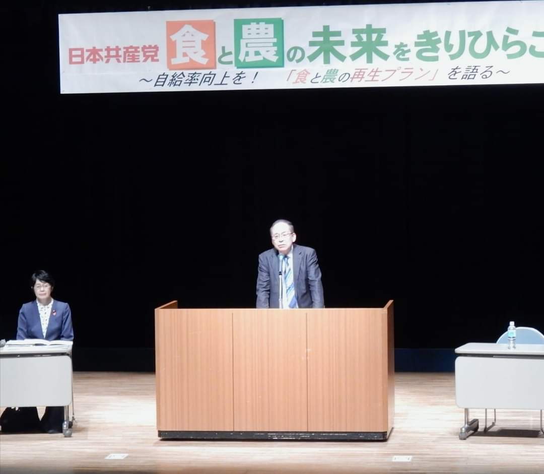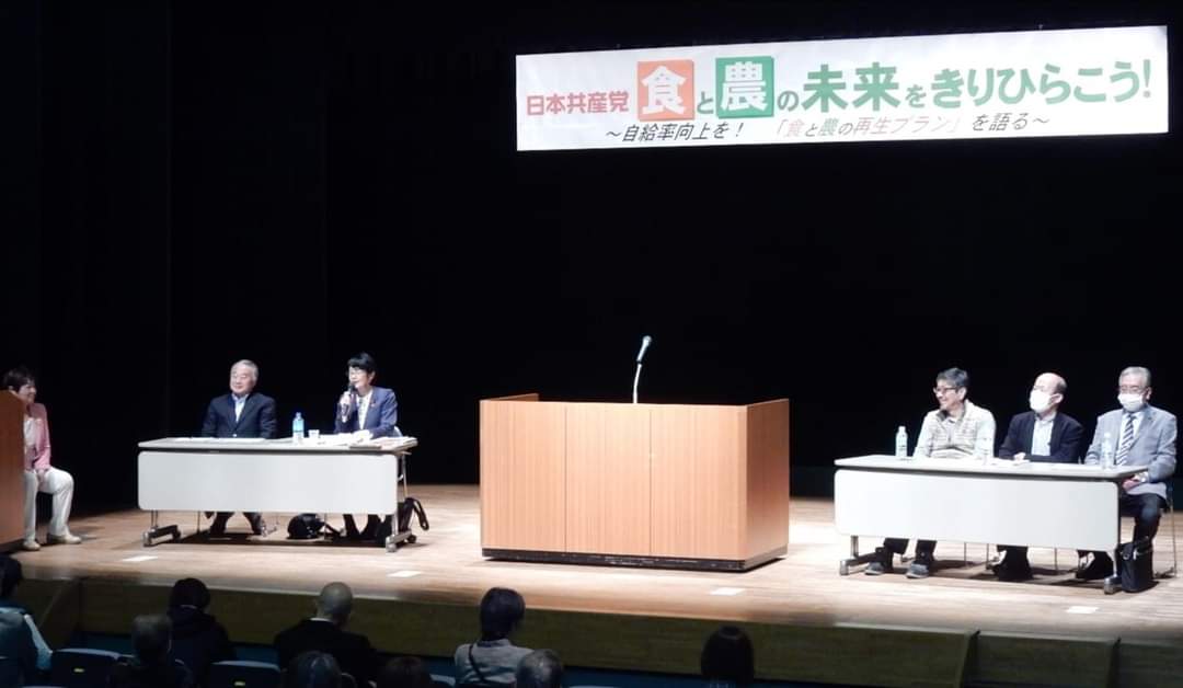 畜産農家で川崎町議の高橋義則氏。宮城県議会の三浦一敏県議団長など3人のパネリストがそれぞれ報告。会場からも質問や意見など寄せられ、それへの答えを含め、お礼の挨拶をさせていただきました。最後に鈴木やすひろ県農業農民後援会事務局長が閉会の挨拶。