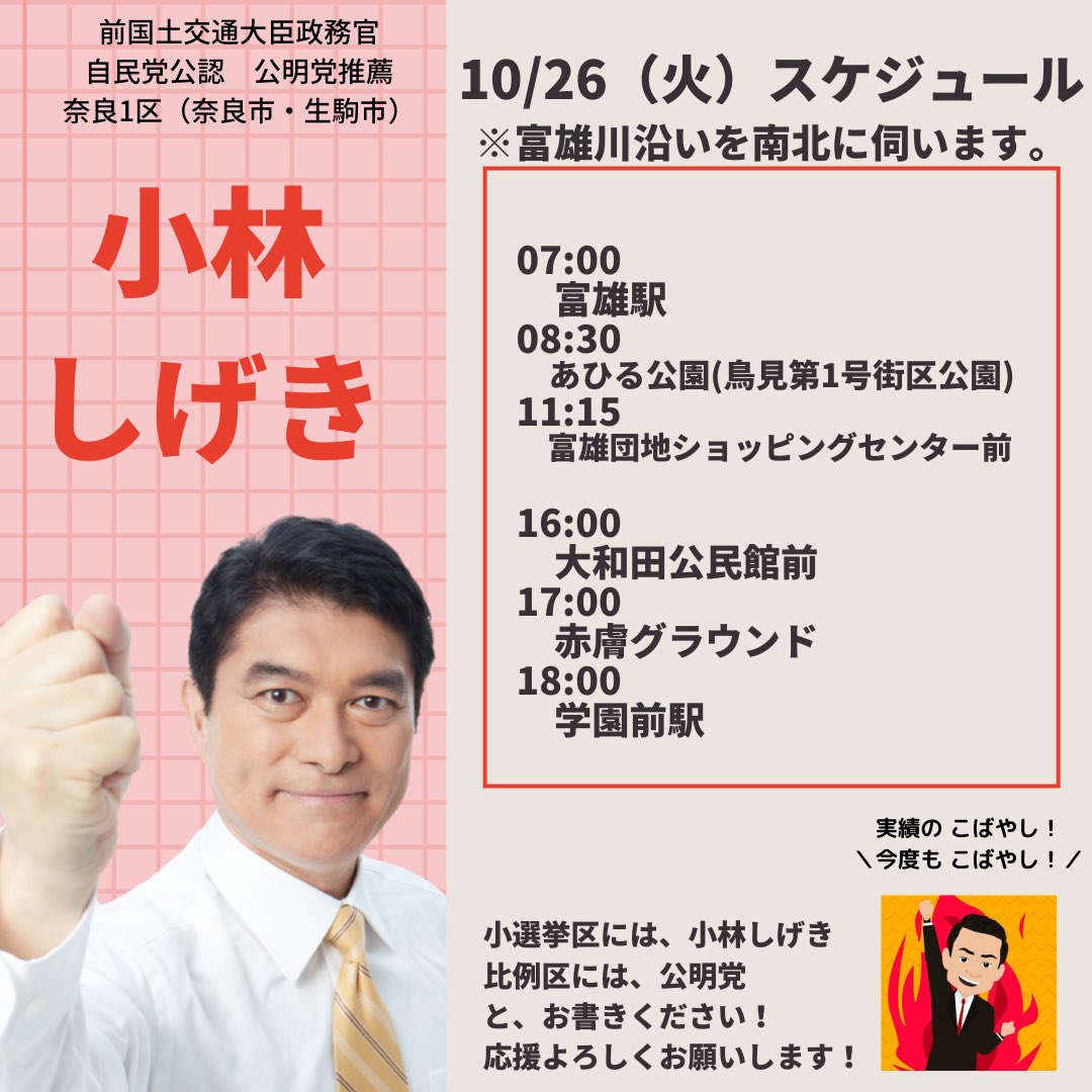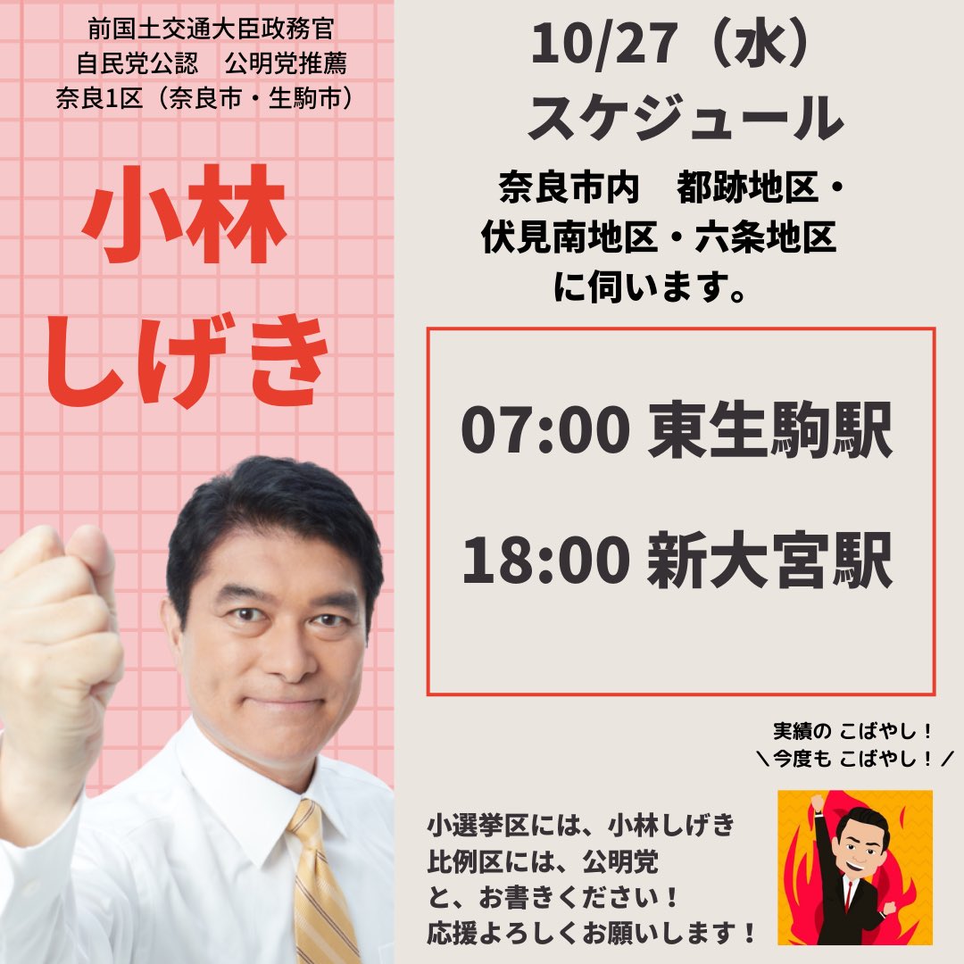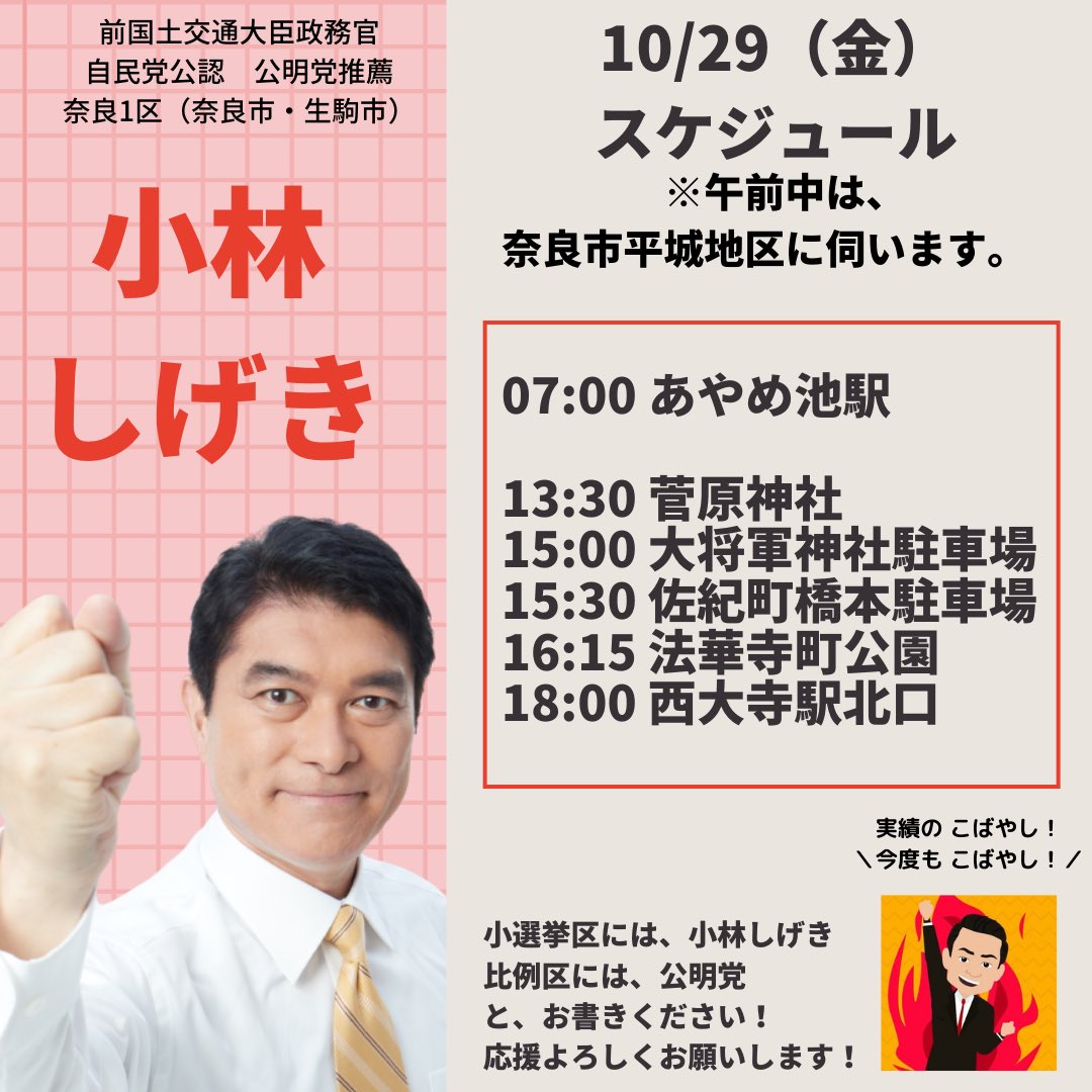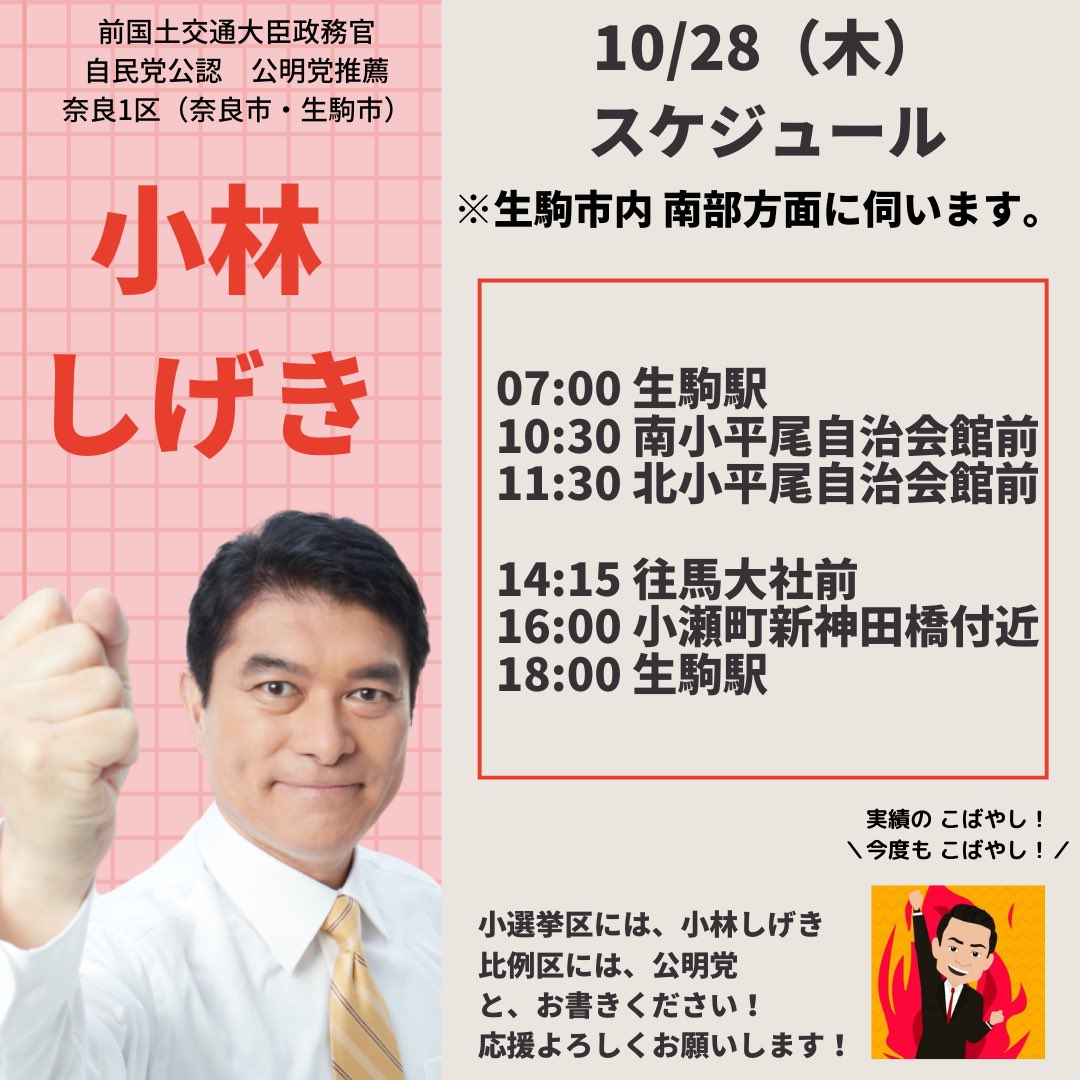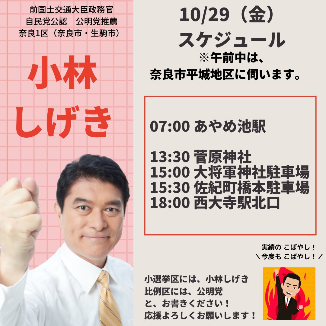 本日は終日選挙カーに乗り、懸命に政策を訴え支持をお願いした。声はかすれてきたがまだまだ体は動く。厳しい戦いに勝ってこそ、国政という重い責務を背負うことができる。#小林しげき #小林しげきアニメーション #小林しげきさんを落選させない運動 #奈良1区