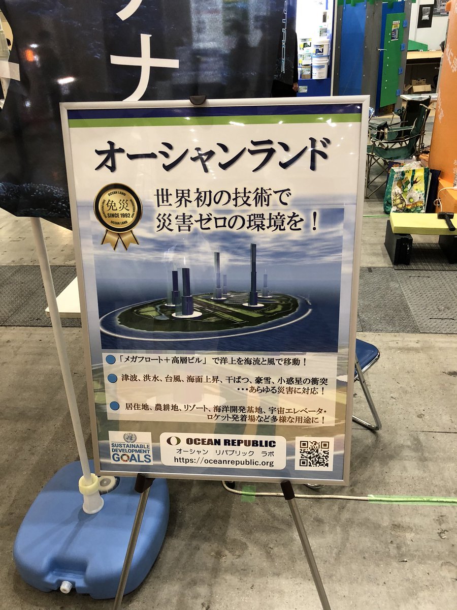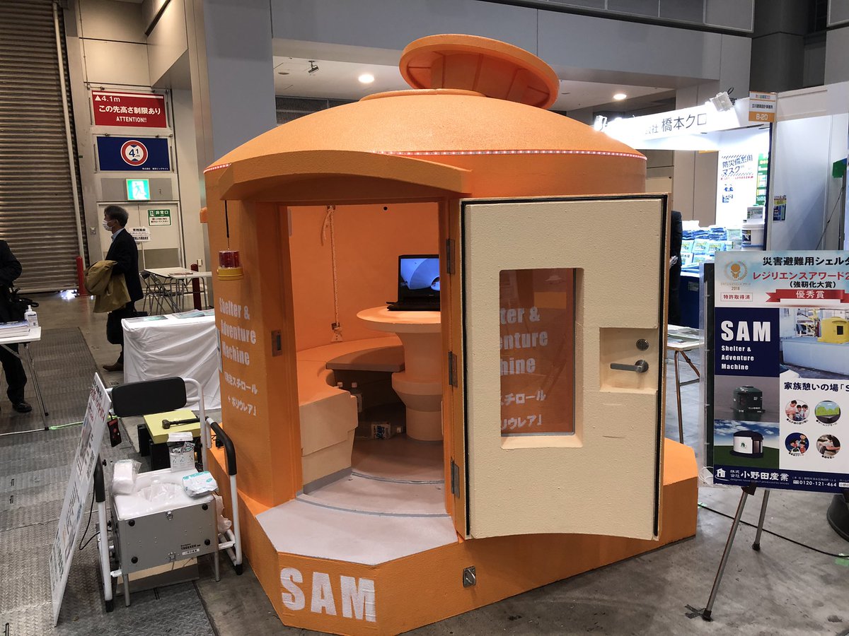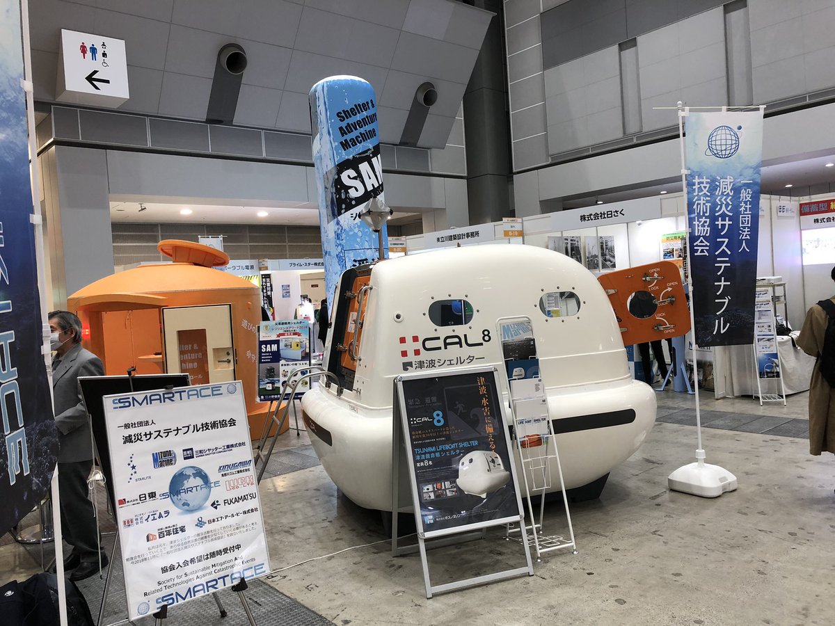 私が特別顧問を務める #減災サステナブル技術工業会でも出展。#荒川氾濫 に備え逃げ遅れた住民を地下シェルターに避難させる研究や富士山噴火の前にマグマを抜く研究なども進めています。ビッグサイトです。