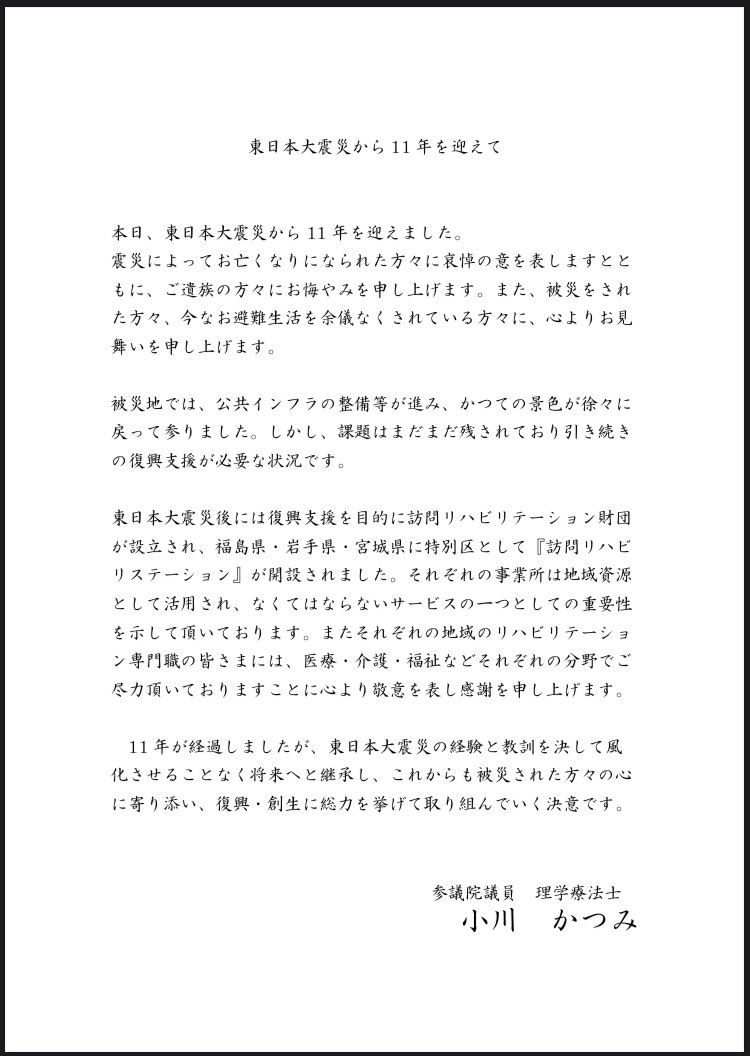医療・介護・福祉分野を中心に国会での議論を皆様へお届けし、小川かつみの政治活動や考えをお伝えしています。登録無料、発行は不定期です。