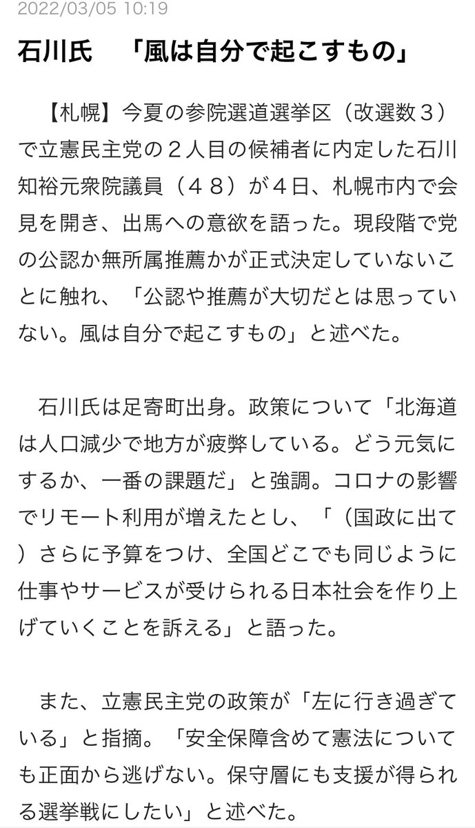 「また国会へ送りたい」 石川知裕氏参院選擁立で立憲関係者(十勝毎日新聞) https://t.co/enbjehj6Ze