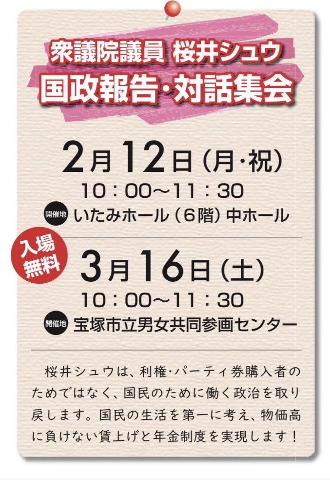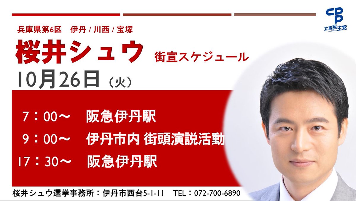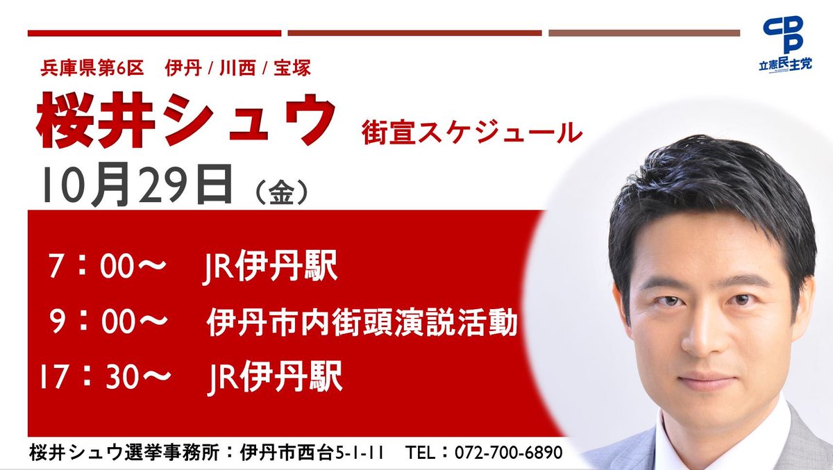 衆議院議員候補の桜井シュウの出発式は、伊丹、川西、宝塚の順に行います。是非、お越しください。