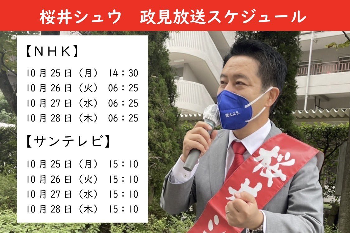 ここまでの熱いご支援に心からします。公職選挙法により、桜井シュウに関するSNS等の投稿、シェア、いいね!、コメントは、全て本日10/30(土)23時59分までとなっております。投開票日の10/31(日)は閲覧のみです。ご理解よろしくお願いします。