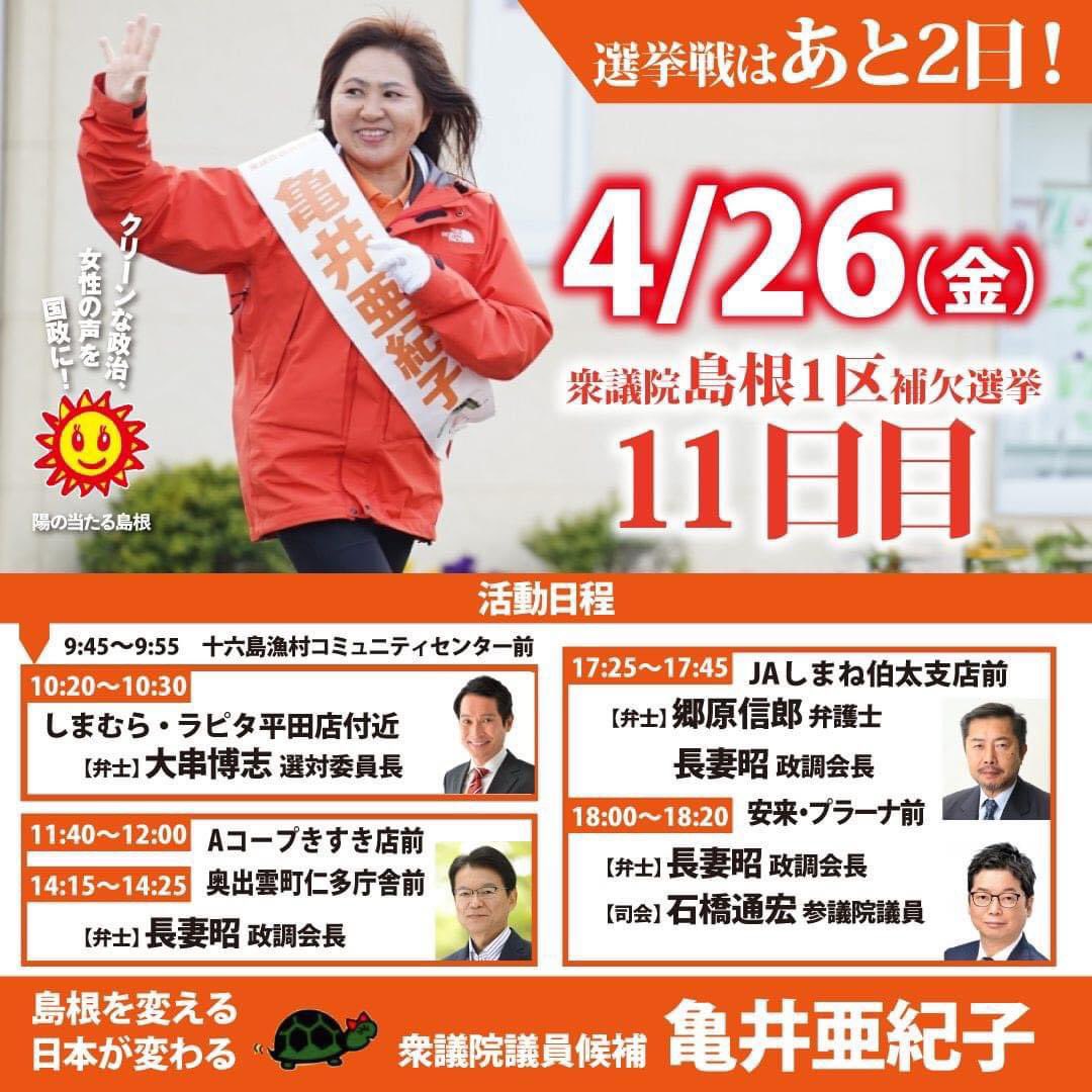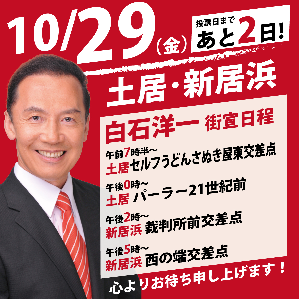 ・12:30新居浜市 新居浜裁判所前交差点・13:30 西条市 白石洋一西条事務所前交差点・15:00今治市 ドンドビ交差点お誘い合わせの上ぜひお越しください!(白石洋一事務所)