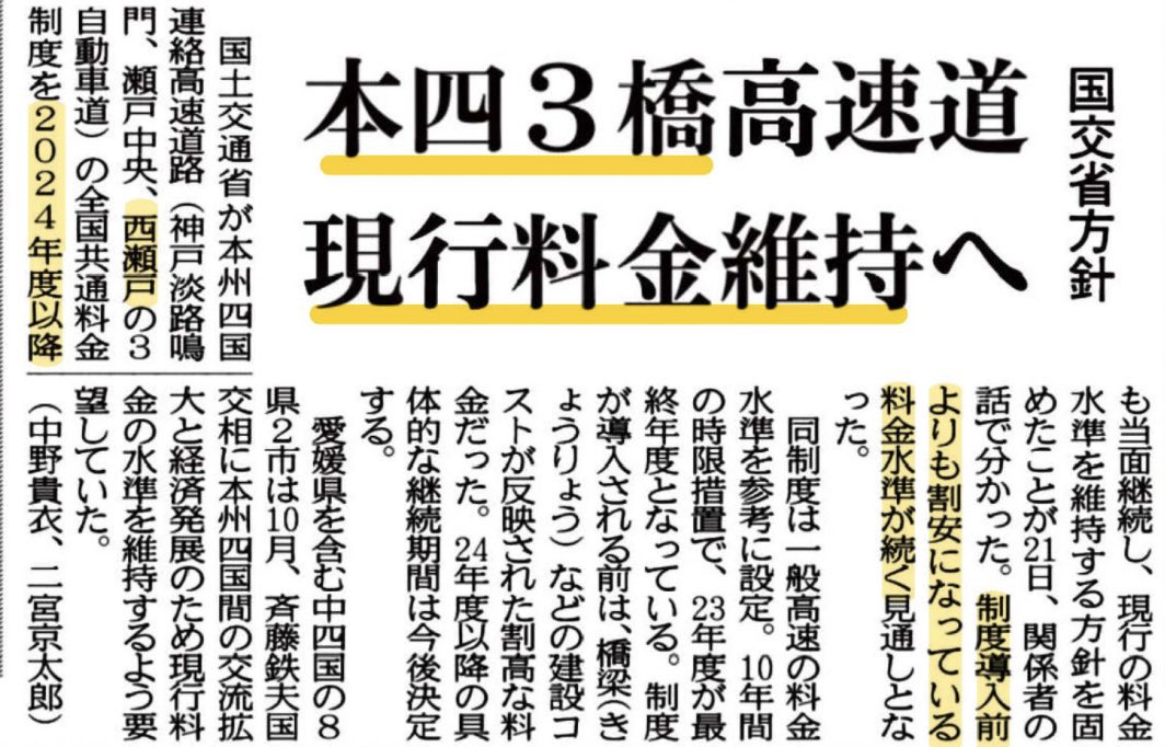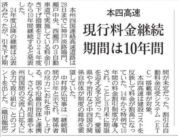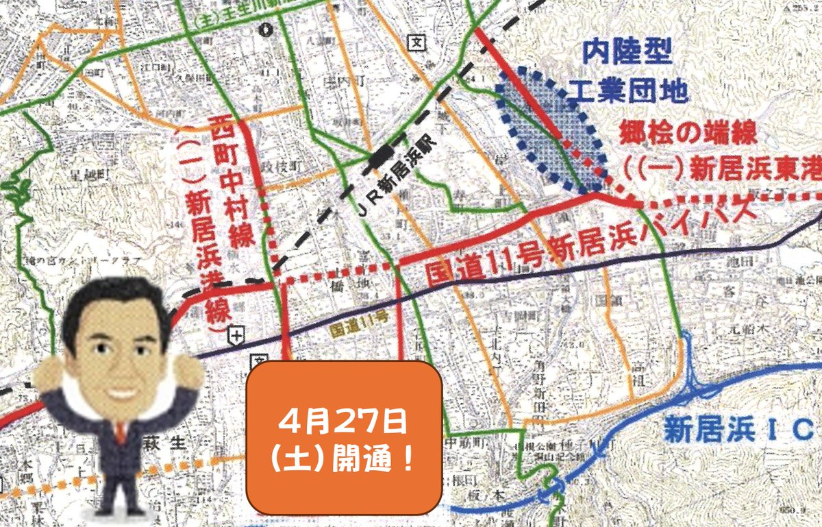 【国道11号バイパスの本郷~西喜光地が4月27日(土)に開通します!】 新居浜市民の皆様の要望の強い工事です。1期目の2009年から国交省に要望し、2期目早々質問主意書で閣議での確認を求めたりしてきました(内容↓)