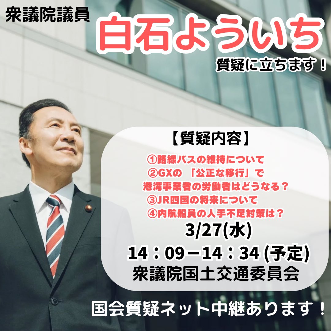 おはようございます!本日、国土交通委員会と本会議です地元 #愛媛県 の暮らしの声を基に全力で頑張ります!白石洋一#今治市 #新居浜市 #西条市 #四国中央市 #上島町 #衆議院議員 #愛媛2区 #あなたと向き合い国を動かす