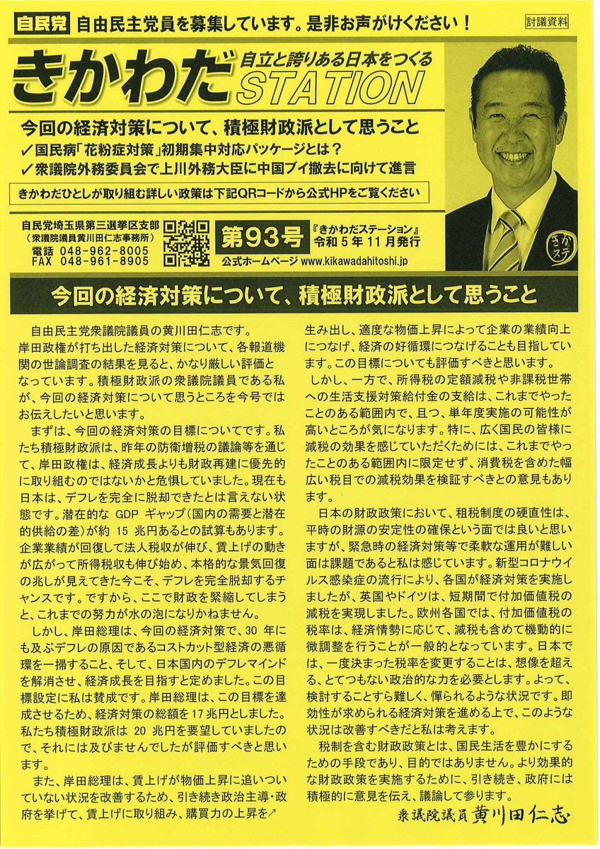 衆議院議員黄川田仁志の政策紙『きかわだステーション第71号』が配付されております。ネットからも読むことができますので、是非ご覧ください。