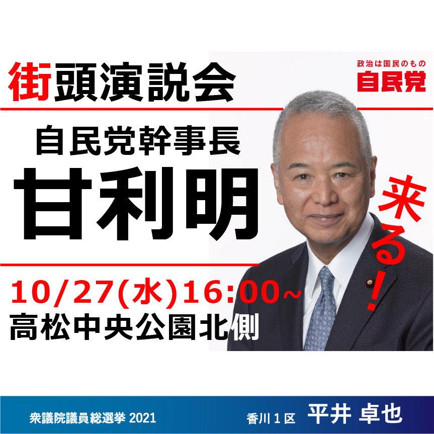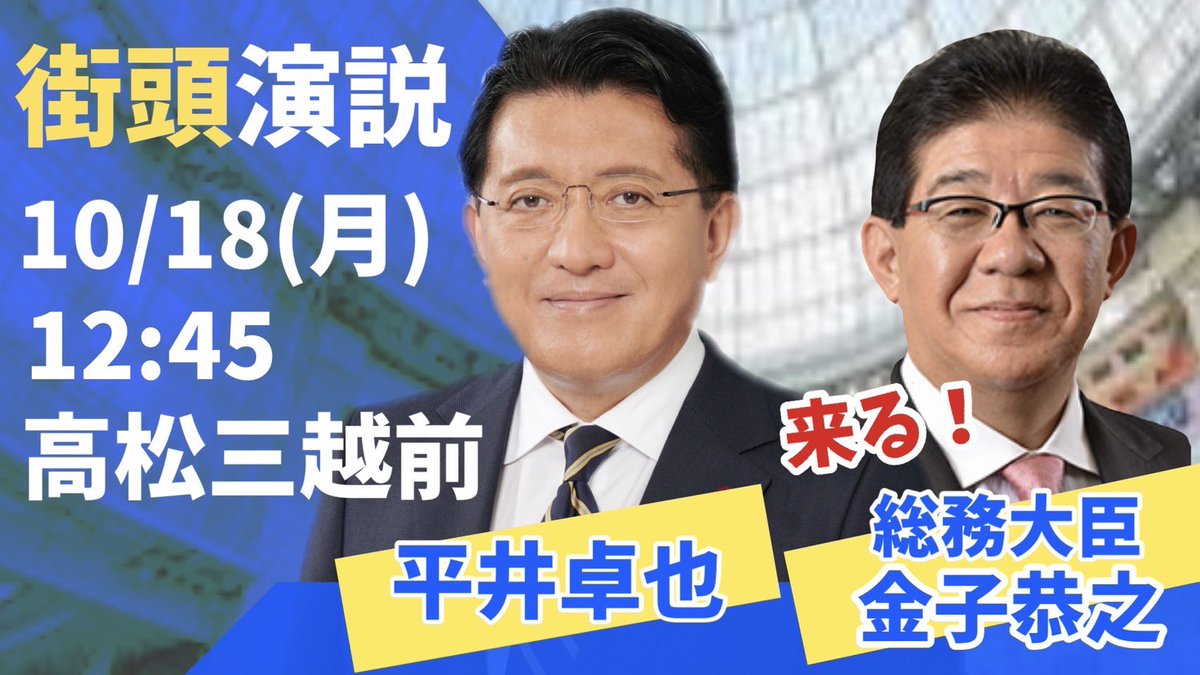 盟友の金子恭之総務大臣をお迎えし、高松三越前をお借りして街頭演説会を開催させていただきました。最後の最後まで宜しくお願い申し上げます。 #平井卓也 #金子恭之 #総務大臣 #香川1区 https://t.co/CHJYVpzb5j 場所: Takamatsu, Kagawa https://t.co/7dCg955UOt