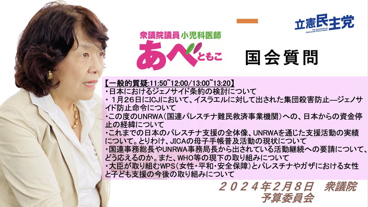 【5/13(月)新型コロナワクチン安全対策見直しを!】週明け月曜日は、決算行政監視委員会で質問です!引き続きご注目ください!⭐️衆議院ネット中継https://shugiintv.go.jp/jp/⭐️党国対youtubehttps://youtube.com/@cdp_kokkai?si=3Rpu76QL6ewEQqFC…(スタッフ)#阿部知子#決算行政監視委員会