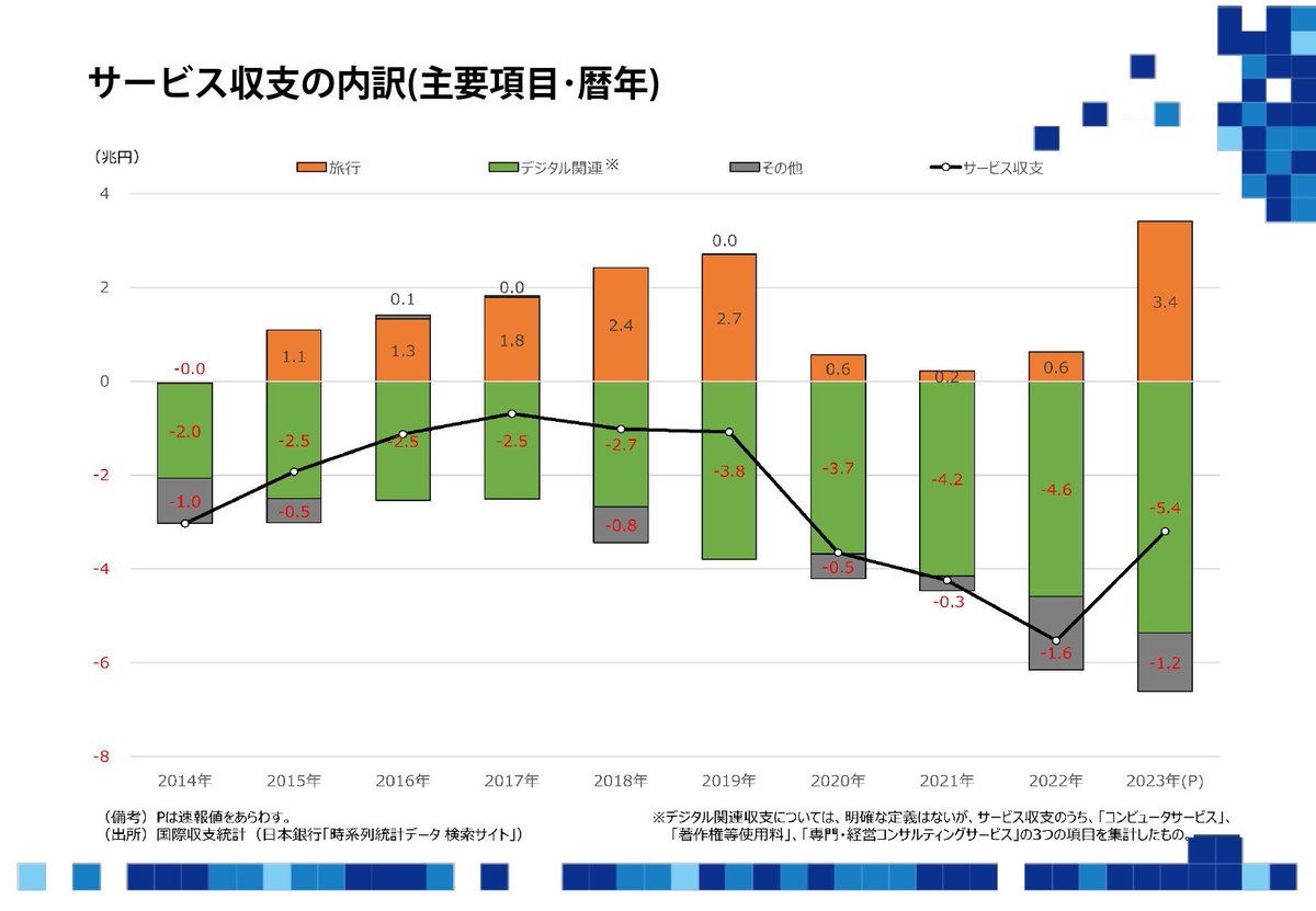 。サービス収支について、IT企業の友人から、デジタル関連(黄緑色)が、2022年の▲4.6兆円に対し、2023年が▲5.4兆円に拡大している点、注意喚起があった。サーバーの海外依存がよく指摘される点だか、安全保障上も国内に、ある程度のサーバーを設ける必要がある。知恵を出して改善を目指す。