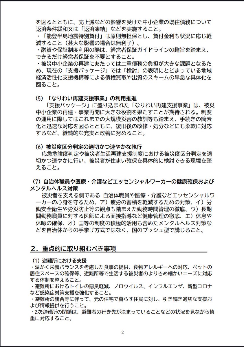 立憲民主党からも総理に求めてきた、被災者生活再建支援金の最高額の600万円への引き上げ。政府は2点の発表。①支援金制度とは別で、県との独自支援策として300万円の制度を新設②対象は高齢者と障がい者世帯のみ一歩前進。でも、これでは若い世代、現役世代の故郷離れを止められない。…