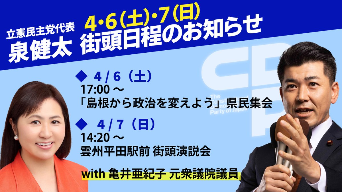 5月4日は、#政権交代行脚 で兵庫2区と7区へ。政治改革のために闘う立憲民主党は、全国の国政挑戦者を募集します。「立憲民主党 公募」でご検索いただき、党HPからお申し込みください。