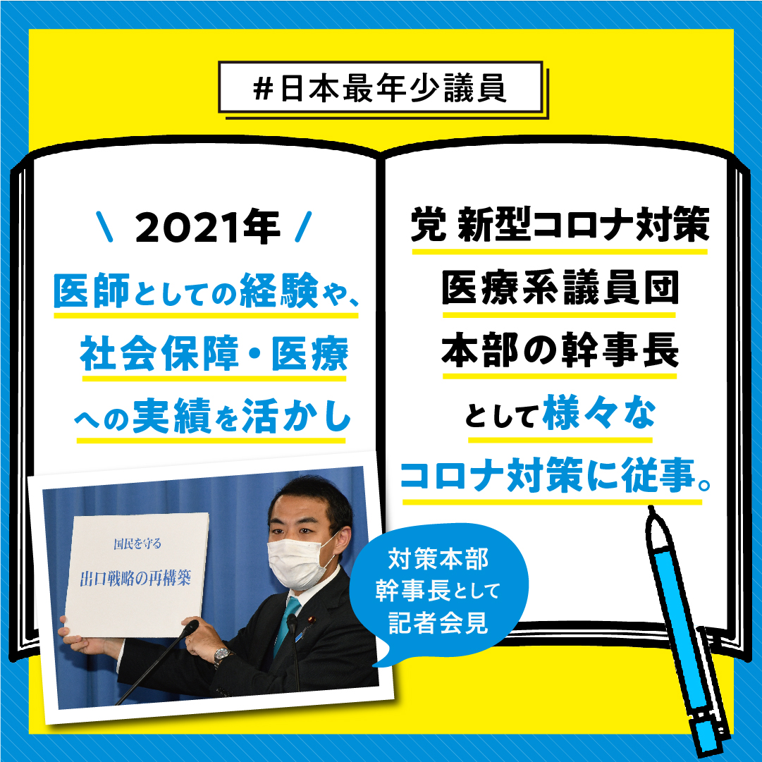 中学時代に医療崩壊を実感し解決できる国会議員を志す→名古屋大卒 医師→最年少 国会議員(28歳) → 最年少 財務大臣政務官(33歳) → 予算委員会 理事→コロナ対策本部 事務局長→最年少 文部科学副大臣(39歳)