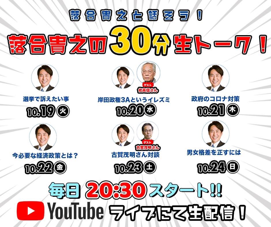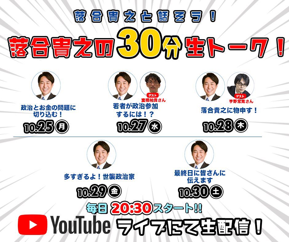 『落合貴之の30分生トーク! 』明日10月27日(水)は「若者が政治参加するには!?」をテーマに、ゲストに日本若者協議会代表理事の室橋祐貴さんをお迎えし、落合貴之とZoomで対談します。質問も募集中です。本日26日はお休みとなります