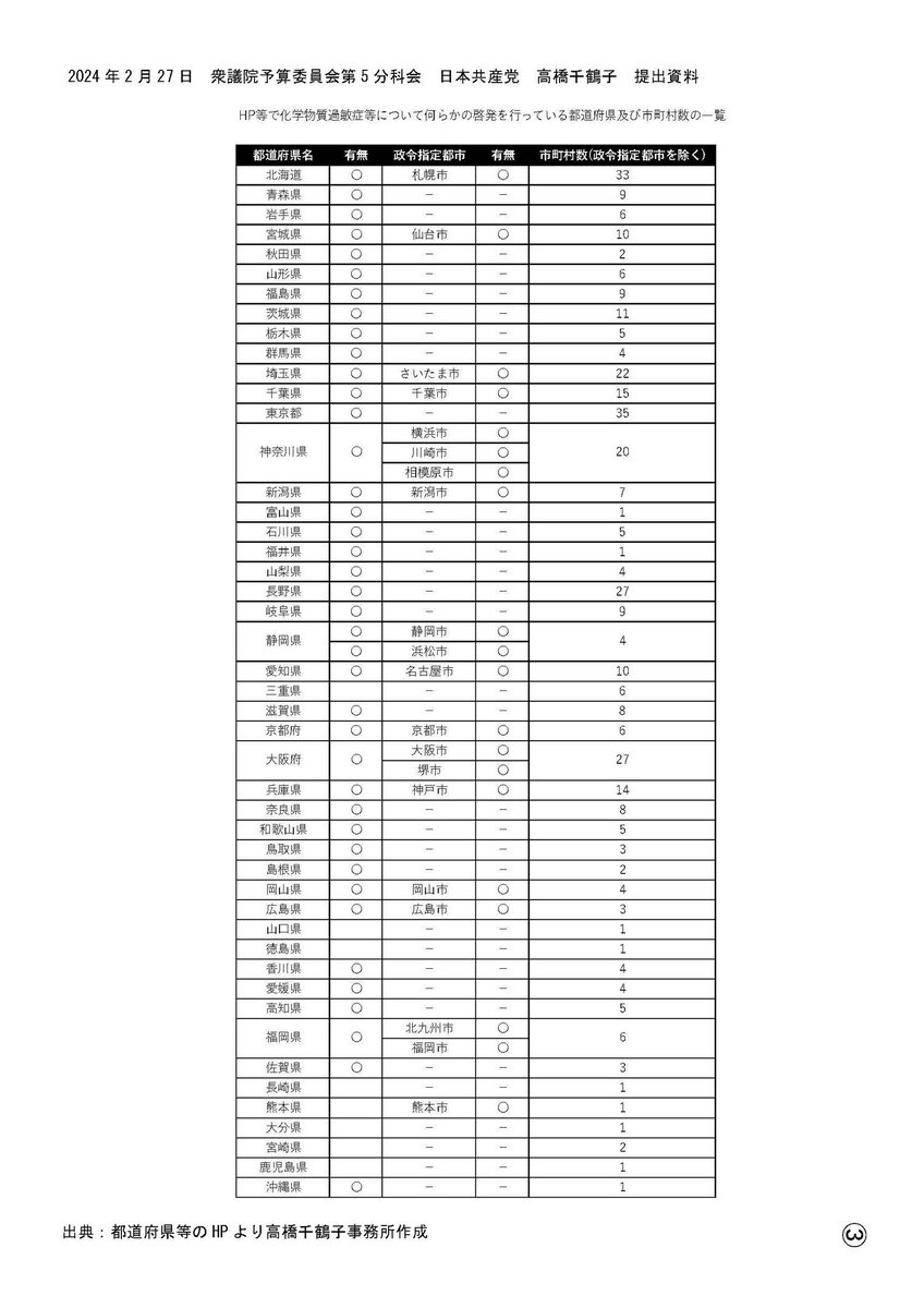 予算第5分科会④全国の自治体HPなどで、香害や化学物質過敏症について何らか啓発を行なっている自治体はどのくらい?大臣「化学物質過敏症を訴える当事者の7割は柔軟仕上げ剤などの香料が契機。病態や機序が不明で診断基準がない。困っているのは事実と、ポスターつくった。自治体も複数掲載している。