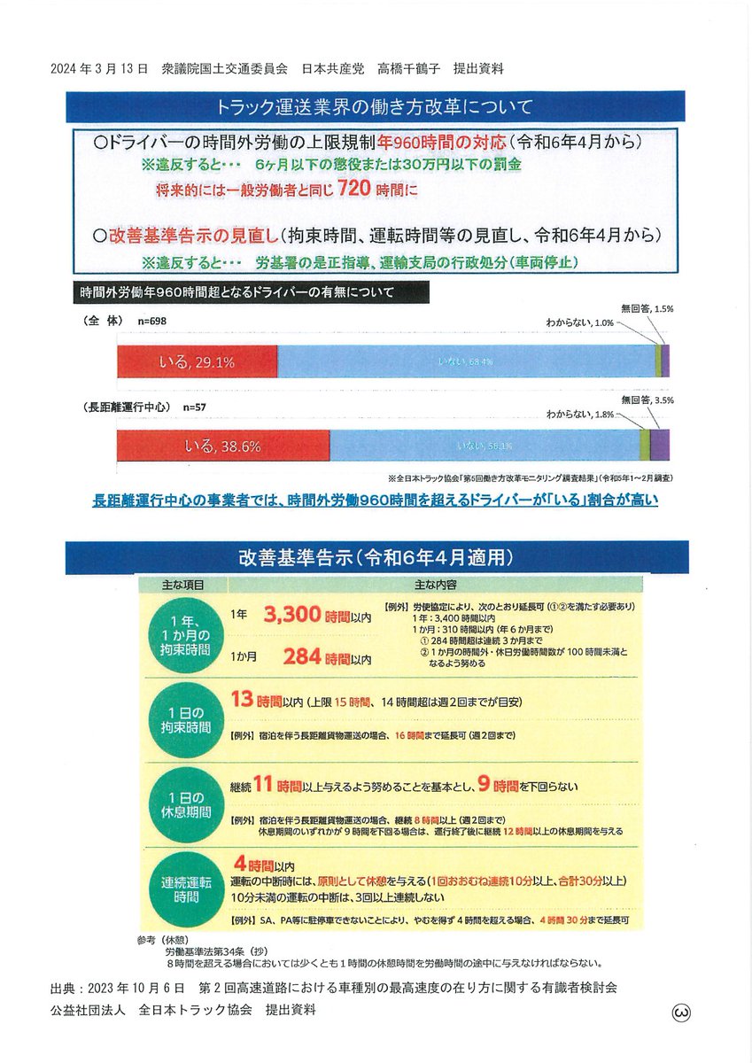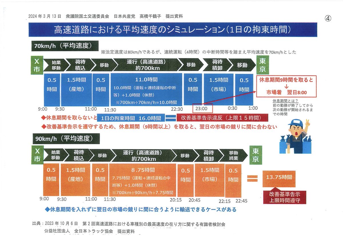 13日国交委⑥今も90キロ近くの速度で走っているから大したことないようにいうが、では最高速度90キロへの引き上げが2024年問題にどれほどの効果ある?局長「労働時間の短縮、物流の効率化に資する。東京〜大阪は550k m。現在は休憩含め7時間半かかっているが、速度規制の見直しで6時間45分程度に」